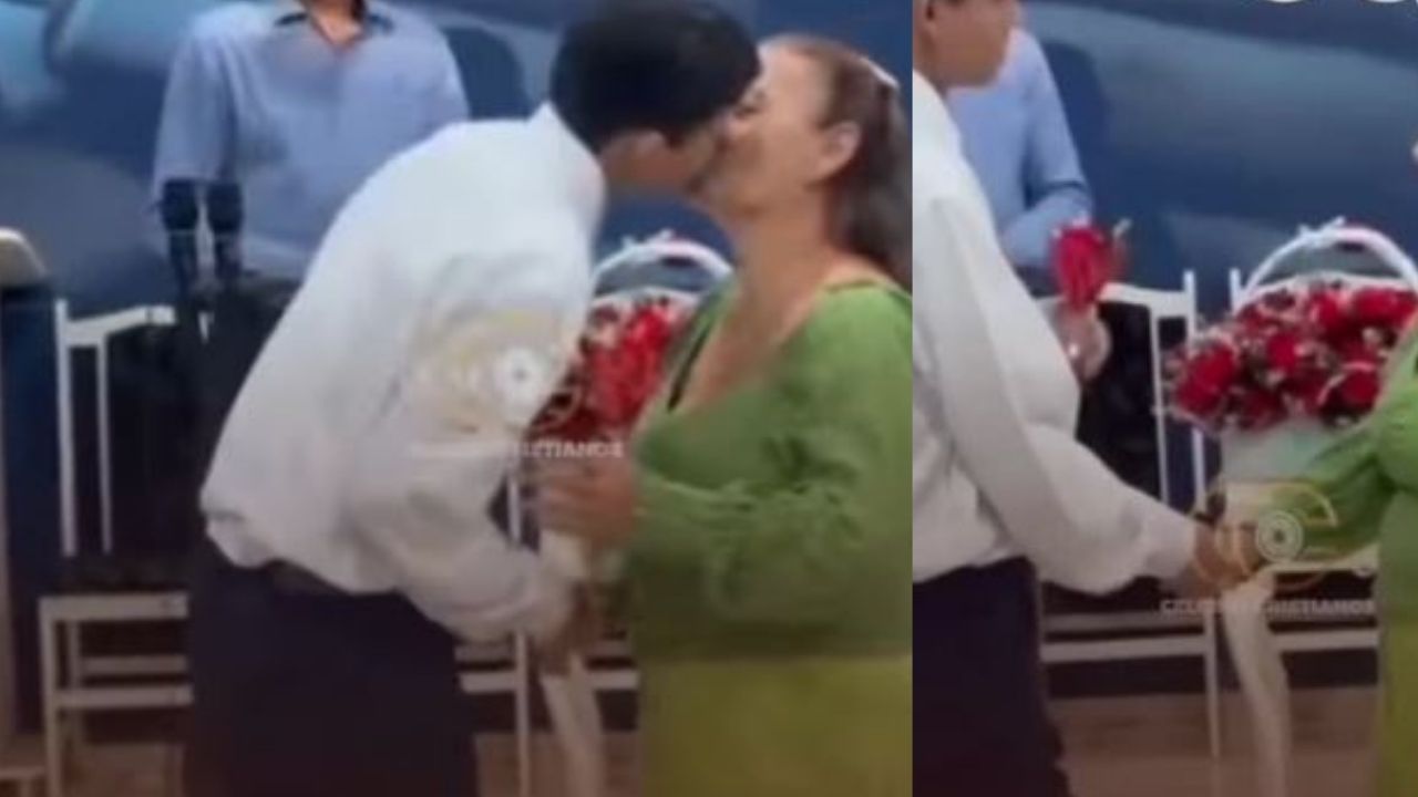 El caso se viralizó luego de que circulara un video en el que se observa el momento en que, frente a una congregación religiosa, ambos sellan su unión con un beso, lo que provocó reacciones inmediatas entre internautas.