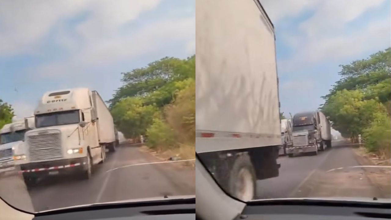 Momentos de tensión y peligro latente captó en video un conductor, pues se observa cómo varias rastras estaban haciendo "piques" o "carreritas" en plena carretera en una zona de Honduras.