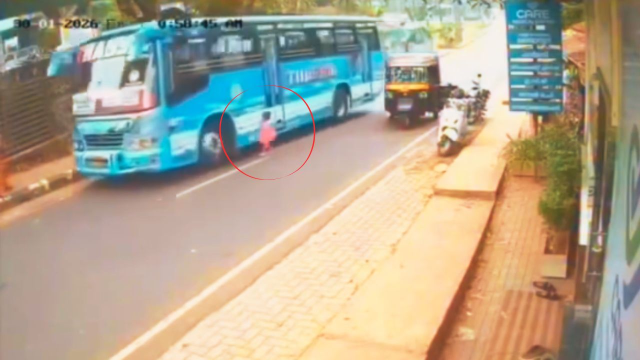 Una niña pequeña se salvó de morir atropellada de forma casi milagrosa luego de que, tras querer cruzar la calle, quedó frente a un autobús en movimiento en una calle de Kozhikode, India, según muestra un vídeo de vigilancia que se ha viralizado en redes sociales.