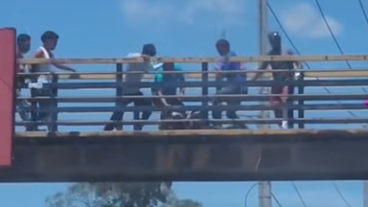 A medida que pasaban los minutos, más hombres iban subiendo a la parte alta del puente para sumarse a darle una lección al sujeto.