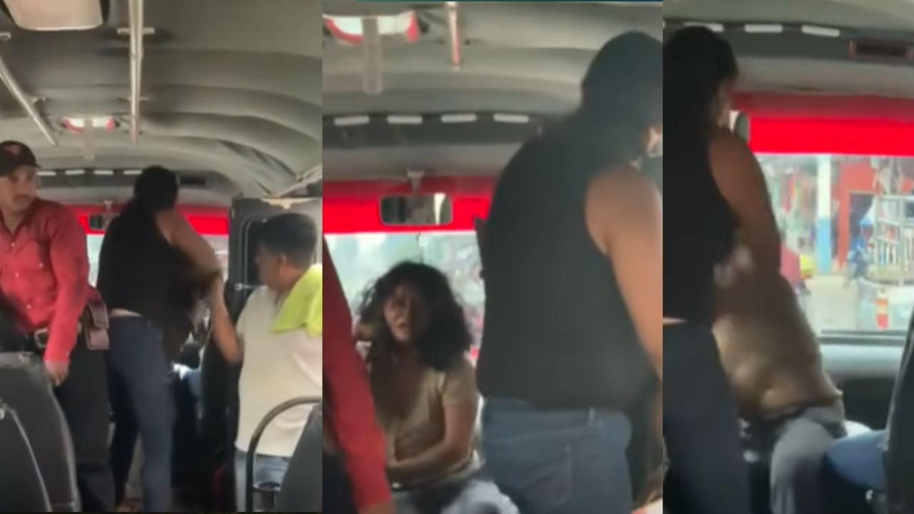 En la grabación se observa a una mujer alta y delgada, vestida con jeans y camisa negra, golpeando y jalando del cabello a otra pasajera, mientras la arrincona sobre el motor del vehículo.