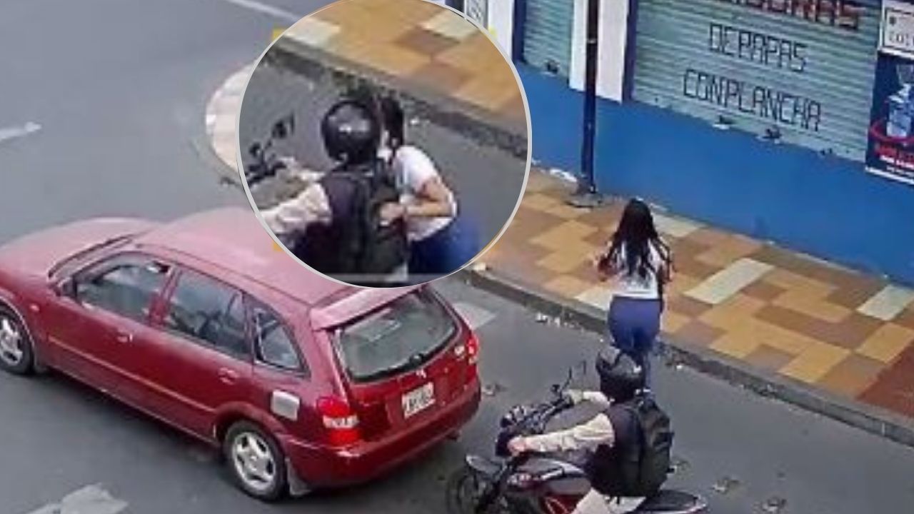 En las imágenes se observa a la pareja detenida en un semáforo. Mientras esperan el cambio de luz, la mujer decide bajarse de la motocicleta y cruzar la calle a pie.